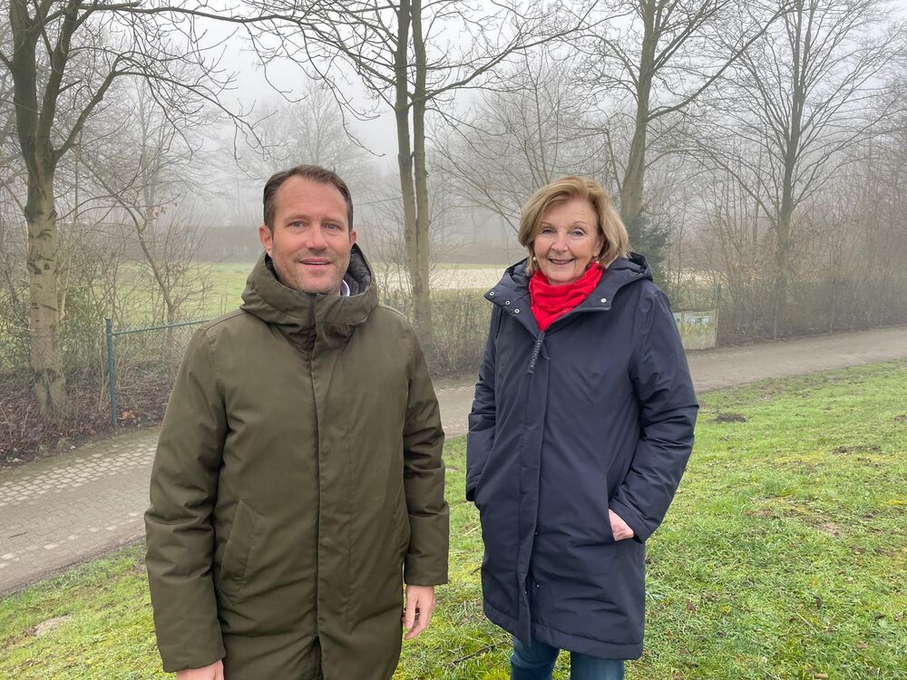 Ratsherr Philipp Hagemann und Bezirksvertreterin Elke Kraut-Kleinschmidt am Standort bei der Sportanlage des BSV Roxel